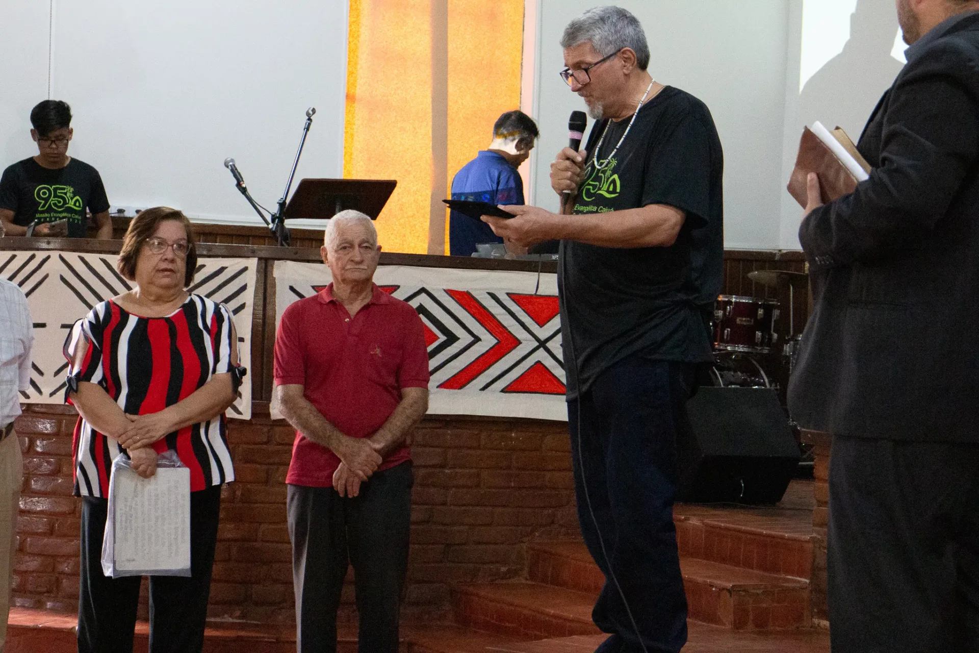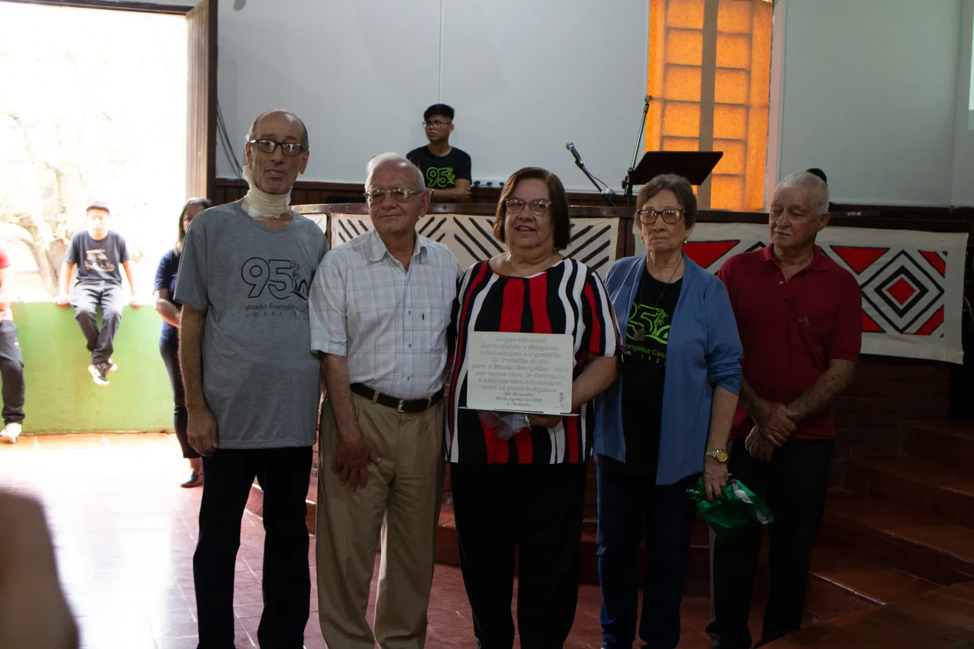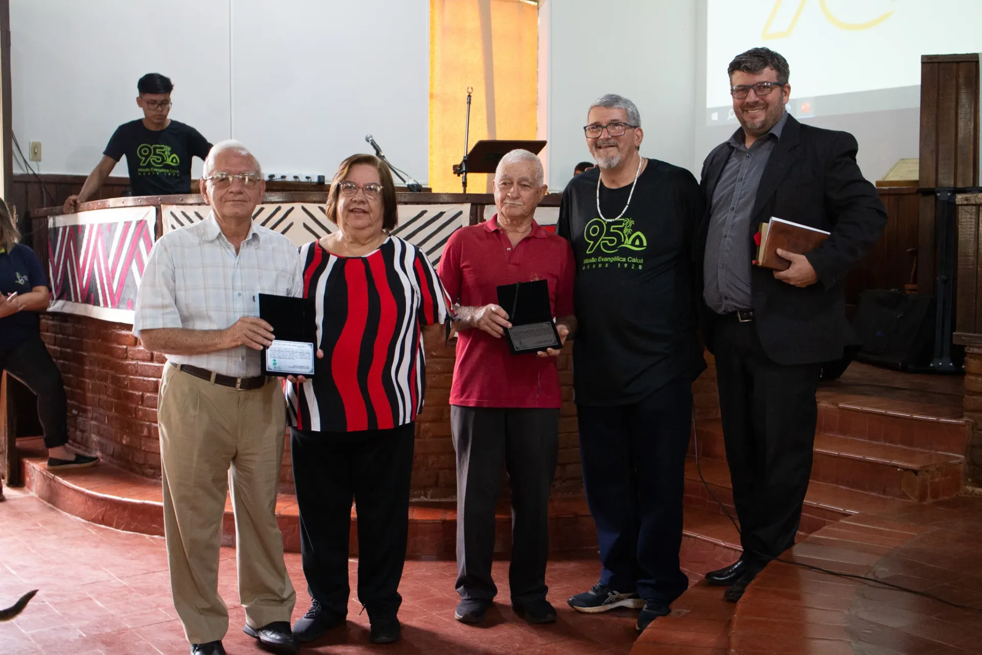 Ao término do culto, dedicamos um momento especial para homenagear o Rev. Beijamim Benedito Bernardes e sua esposa Margarida, que encerraram um período de 38 anos à frente da Missão. Também prestamos homenagem ao Presb. Enoque Bernardes, que dedicou 30 anos de sua vida como construtor de várias igrejas nas aldeias e edifícios na Sede, junto com sua esposa Gracinha.