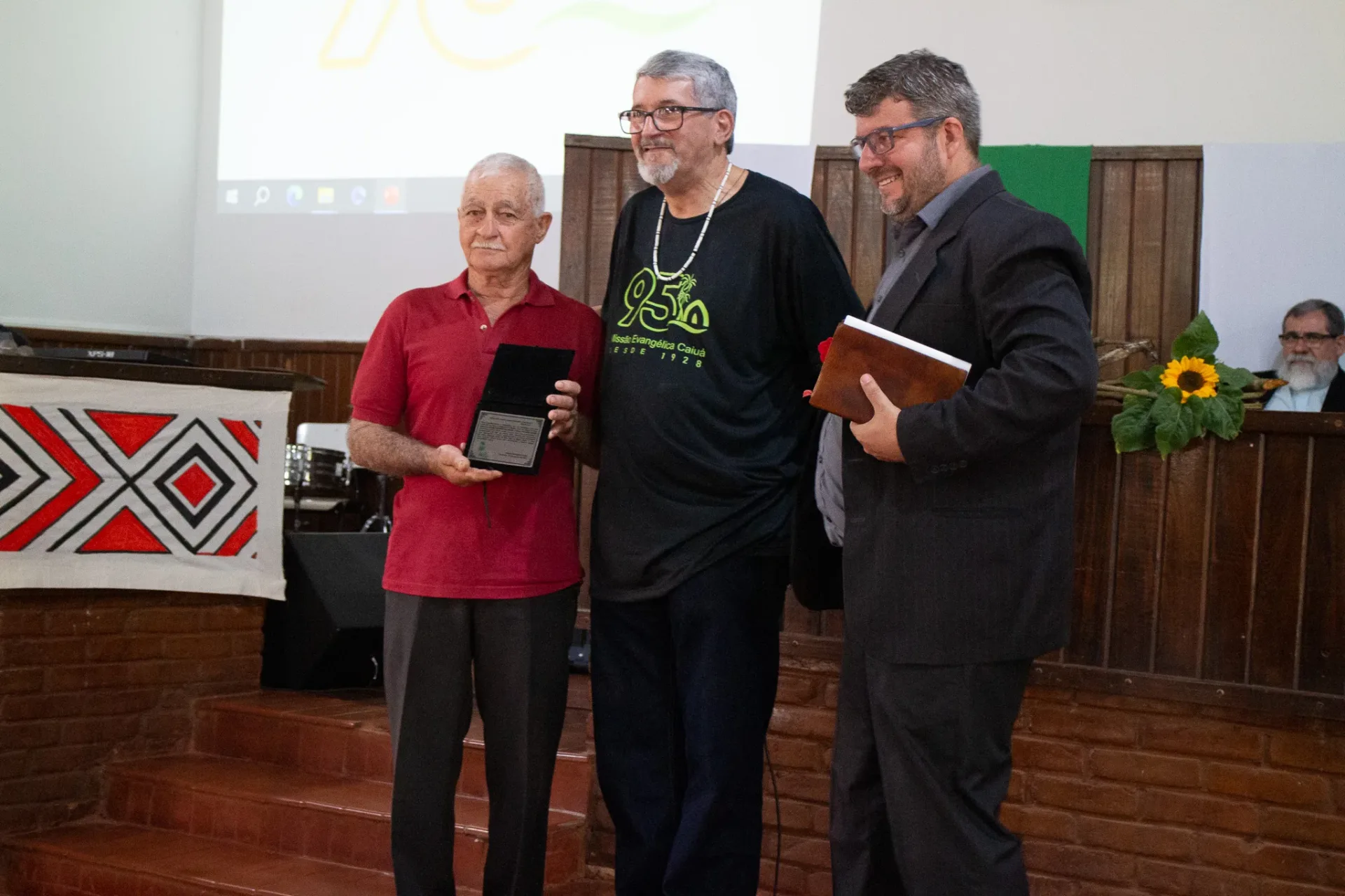 O casal Vera Villon e Jorge Villon, representantes do “Trabalho do Rio de Janeiro”, também prestaram suas homenagens. Uma família Kaiowá honrou o Reverendo, lembrando da relação e respeito desde seu pai, entregando um quadrinho com o rosto do casal entalhado na madeira. Representando a APMT, o Rev. Marcos Mota encerrou o momento das homenagens dentro do templo, e seguimos para a frente do templo, onde indígenas realizaram uma dança típica de sua cultura em homenagem ao Reverendo Beijamim, erguendo-o e proclamando a palavra “Honoyo”, que significa Vitória.